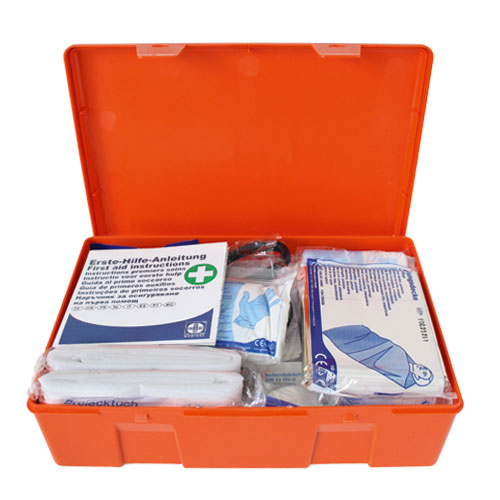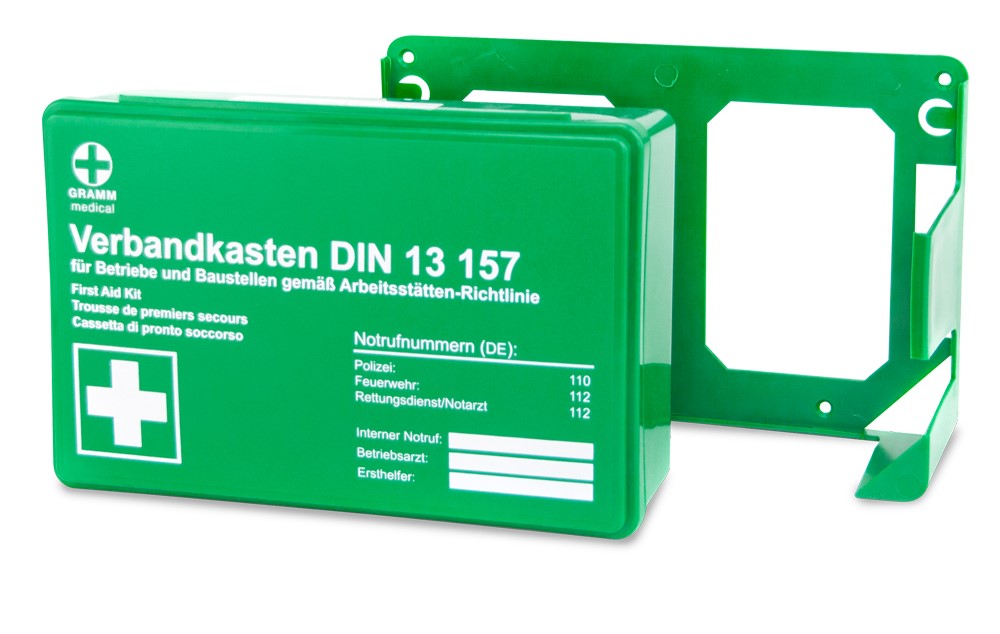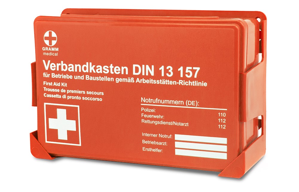 Kompakter Verbandskasten zum stationären Einsatz für Ihren Betrieb oder Büro, vollständig gefüllt nach DIN 13157.