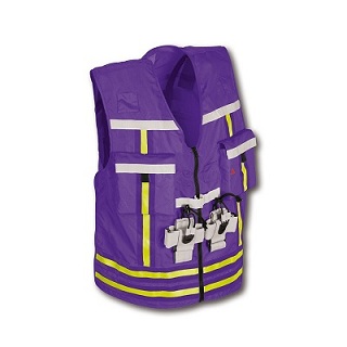 2 Funkgerätehalterungen, die Sicherungsschlaufen sind längenverstellbar, Halteschlaufen für die Antennen, Klemm-schlaufen für die Mikrofone im Schulter- und Brustbereich, 2 Brusttaschen für DIN A6 Notizblöcke, Brust- und Rücken-flausch für Klettschilder.
