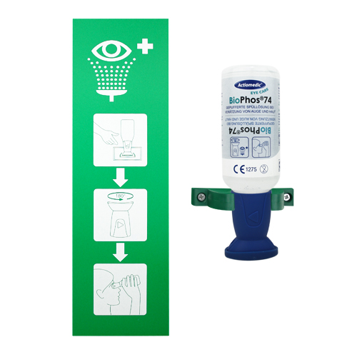 Einfach bedienbare Augenspülstation zur Wandmontage mit einer sterilen und sofort verwendbaren Flasche.