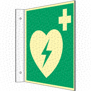Defibrillator DIN EN ISO 7010 langnachleuchtendes Fahnenschild zur Kennzeichnung eines AED´s