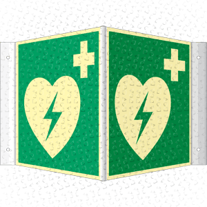 Defibrillator DIN EN ISO 7010 langnachleuchtendes Winkelschild zur Kennzeichnung eines AED´s und Defibrillatoren