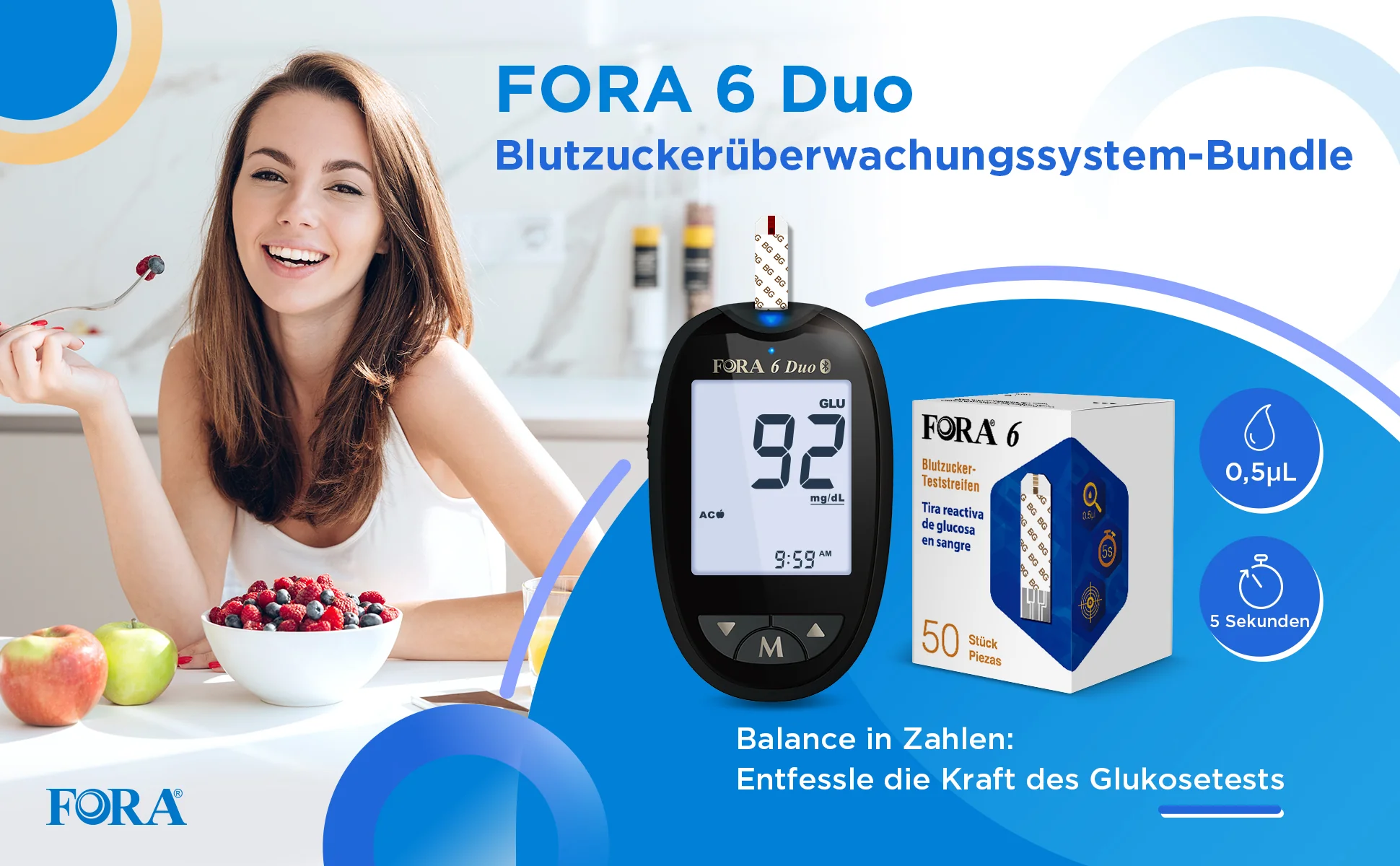 Multi-Parameter: Misst 2 Parameter, Blutzucker (BG), β-Keton (KB), für Menschen Einfach und schnell, bereit zum Mitnehmen: Legen Sie einfach die Teststreifen ein und Sie können Ihre Messwerte in wenigen Sekunden erhalten. Das Starterset enthält FORA 6 DUO, Blutzuckerteststreifen 60 Stück, Lanzetten 10 Stück, Stechhilfe. Das Set deckt den Testbedarf für alle Arten von Parametertests ab.