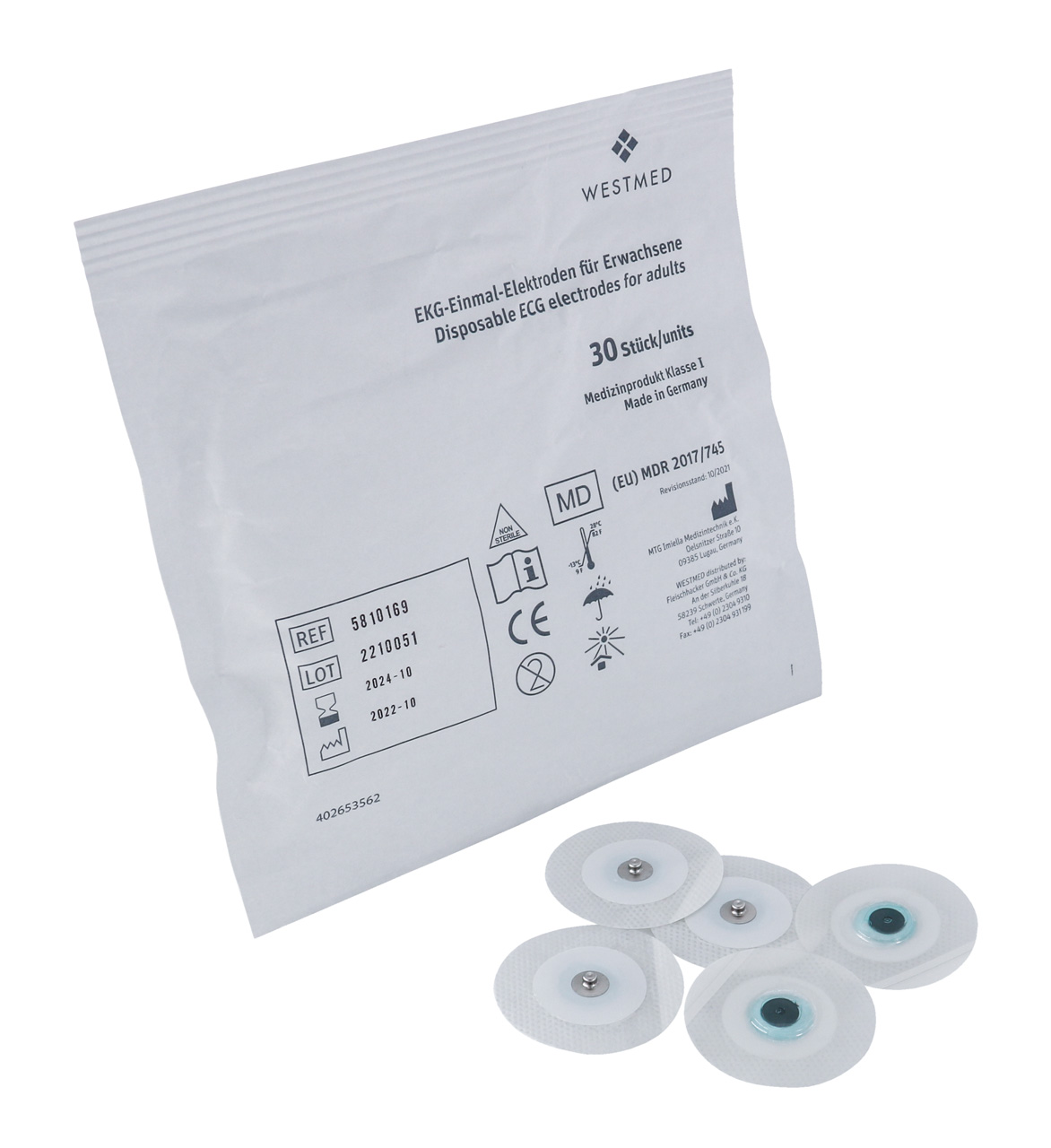 Die 50 mm runden WESTMED® EKG-Einmal-Elektroden mit Druckknopfanschluss bestehen aus einem atmungsaktiven Gewebeträger und sind daher sehr hautfreundlich. Als Kontaktgel dient das Solid Gel.