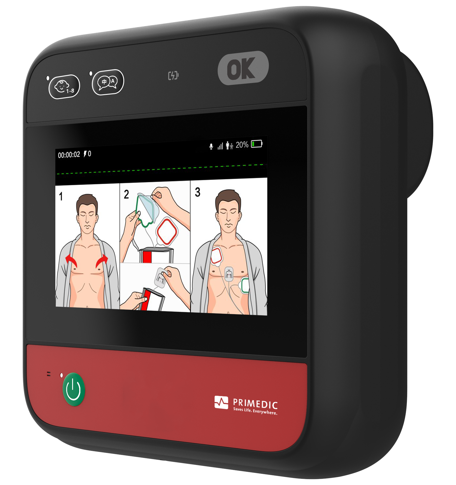 Per Sprachwahltaste lassen sich die Sprachanweisungen im laufenden Betrieb zwischen bis zu sechs Sprachen wechseln. In Bereichen mit Anwendern verschiedenster Nationalitäten - Industrie, Flughäfen, öffentlichen Einrichtungen - steigt somit die Chance, dass der HeartSave myPAD sicher verstanden und angewendet werden kann.