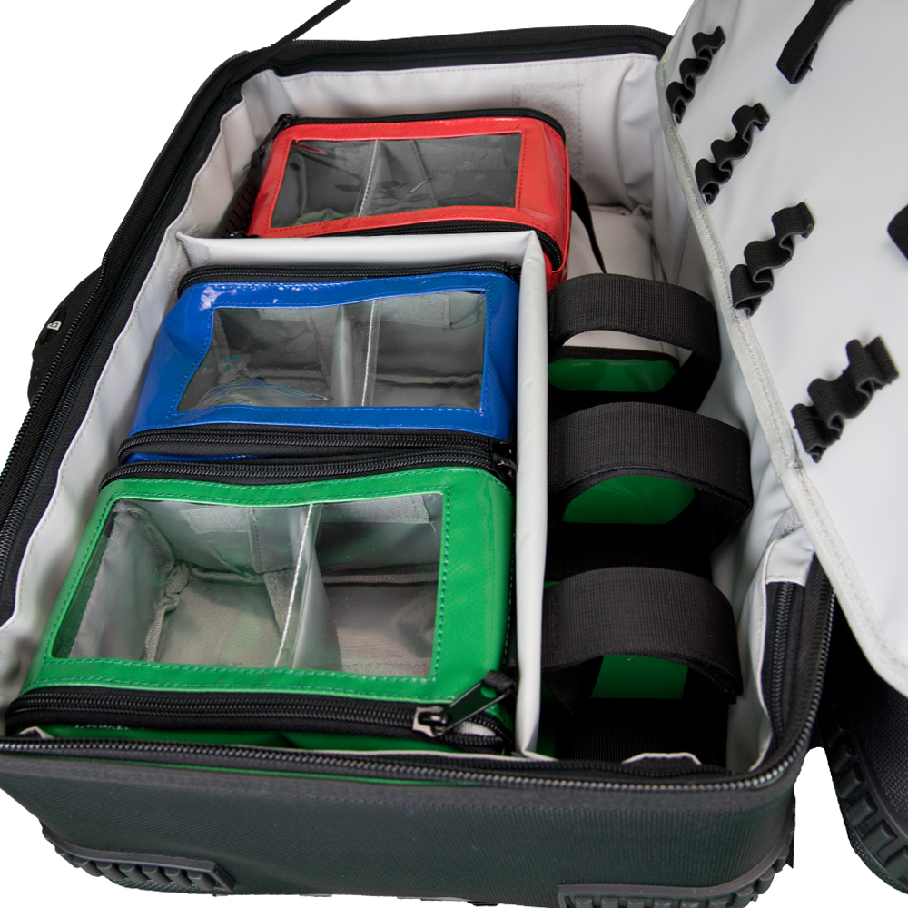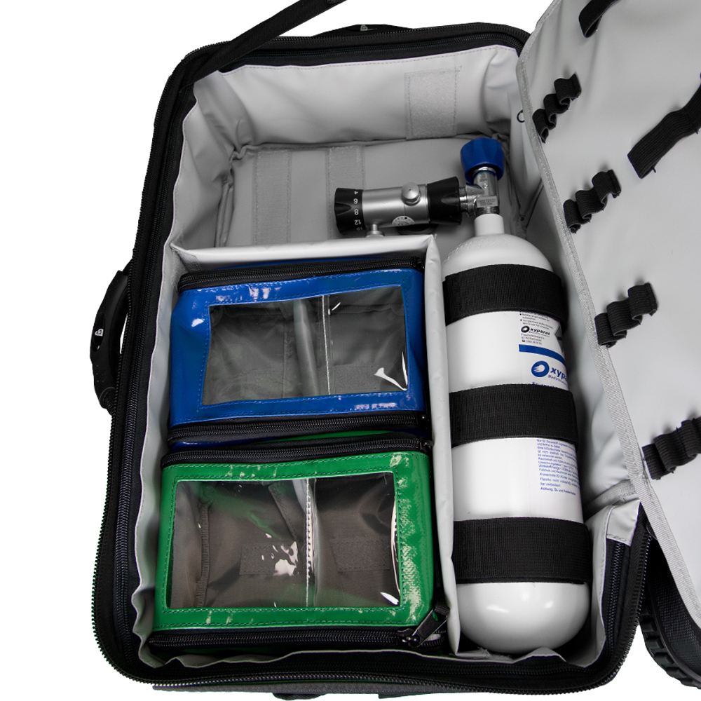 Diese flexible Notfalltaschen-Rucksackkombination kann sowohl als Notfallrucksack als auch als Notfalltasche mit verstaubaren Schultergurten verwendet werden. Außen finden Sie unser bewährtes Planenmaterial vor, welches an übermäßig beanspruchten Stellen, wie z. B. am Boden, verstärkt wurde um eine noch längere Haltbarkeit und Strapazierfähigkeit zu erreichen. Im Innenraum befinden sich sieben farblich kodierte Modultaschen mit Sichtfenster, sowie eine O2-Flaschenhalterung (für Flaschen mit bis zu 2 Liter Fassungsvermögen). Außerdem können Sie die Front des Objekts um 180° aufklappen und haben dank des flexibel einstellbaren Trennelementes alles schnell im Blick und zur Hand.