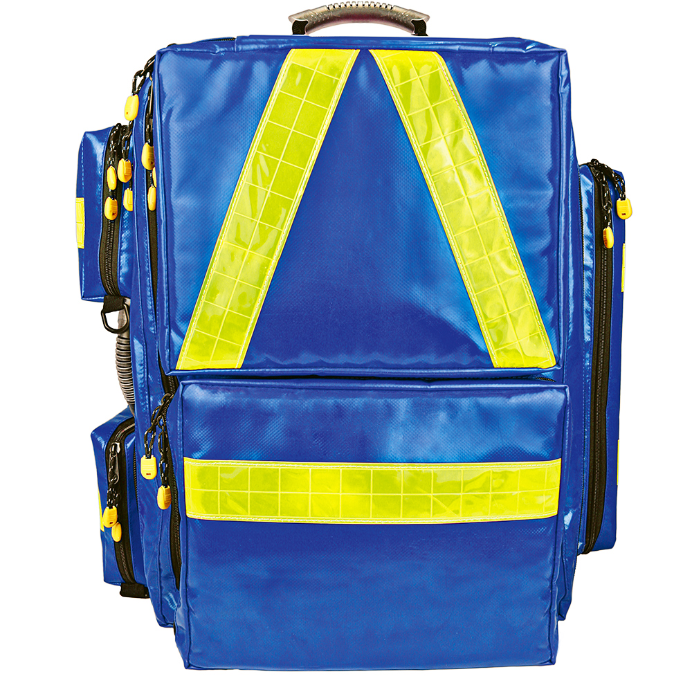 Der hochwertige Profi ist unser größtes Notfallrucksack-Modell. Dieses Notfallbehältnis fällt durch eine Vielzahl an Features auf. Ein besonders bemerkenswerter Vorteil liegt in der Möglichkeit, den Rucksack auch wie eine Tasche tragen zu können. Im PROFI-Notfallrucksack finden Sie umfassend Stauraum, auch für umfangreiche Einsätze. Man kann den Innenraum komplett aufklappen und gelangt so problemlos an den Inhalt. Auf dem Trennelement ist eine Vielzahl von Gummilaschen angebracht, an denen z. B. Guedeltuben, Spateln und anderes Notfallequipment übersichtlich angebracht werden kann. Viele externe Taschen (drei Seiten- und zwei Vordertaschen), eine intelligente Inneneinteilung, eine Sauerstoffflaschen-Halterung und vier separaten Modultaschen runden den Nutzenumfang für den Anwender ab. Verstärkte, gepolsterte Schultergurte und ein Bauchgurt sorgen für einen angenehmen Tragekomfort. Um für eine gute Erkennbarkeit während des Einsatzes zu sorgen, sind auf der Frontseite, auf der Ober-, Rück- und auf den Seitentaschen, sowie auf den Schultergurten gelbe Reflexstreifen vernäht.