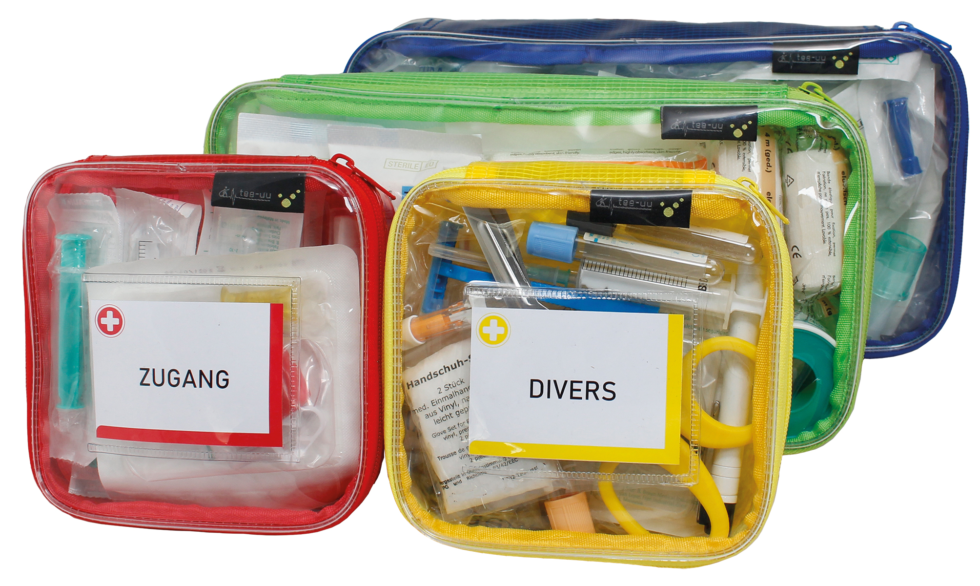 - eindeutig definiert: farbkodierte Modultaschen in rot, gelb, blau und grün