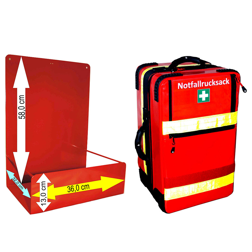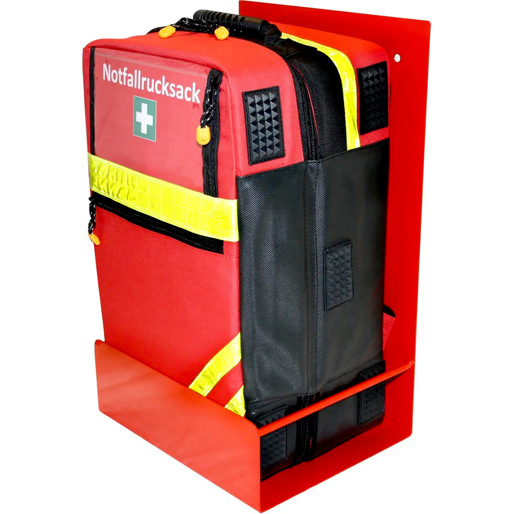 Stabile Wandhalterung aus Stahl für verschiedene unserer Notfallrucksack-Modelle. In roter Signalfarbe, zum selbstmontieren. Schnell angebracht und einsatzfertig! Für die Modelle: X1